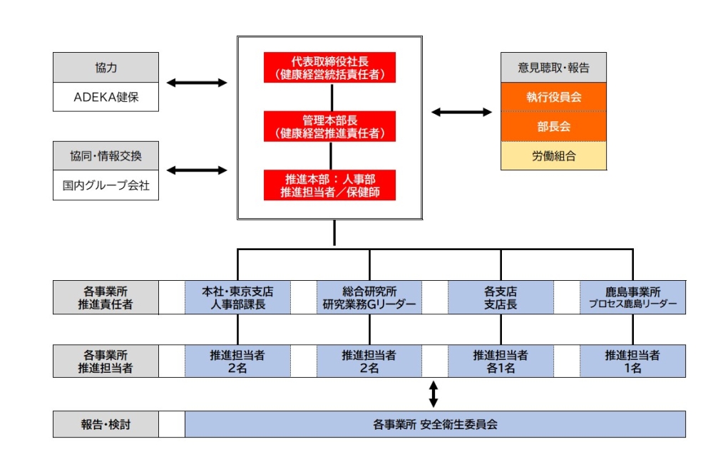 社長を「健康経営統括責任者」、管理本部長を「健康経営推進責任者」とし、「人事部」「健康経営担当者および保健師」を中心とした事務局および、各事業所には「推進責任者」「推進担当者」を配置しています。また、健康保険組合や安全衛生委員会、労働組合とも連携し、健康経営を推進しています。